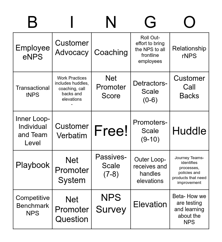 This bingo card has a free space and 24 words: Net Promoter System, Net Promoter Question, Net Promoter Score, Competitive Benchmark NPS, Relationship rNPS, Employee eNPS, Transactional tNPS, Customer Advocacy, Promoters- Scale (9-10), Passives- Scale (7-8), Detractors- Scale (0-6), Inner Loop- Individual and Team Level, Outer Loop- receives and handles elevations, Journey Teams- identifies processes, policies and products that need improvement, Work Practices includes huddles, coaching, call backs and elevations -, Elevation, Huddle, Coaching, Customer Call Backs, Customer Verbatim, Beta- How we are testing and learning about the NPS, Playbook, Roll Out- effort to bring the NPS to all frontline employees and NPS Survey.