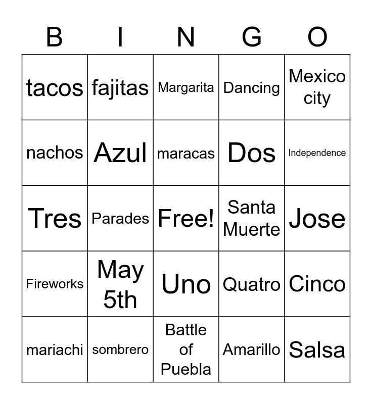 This bingo card has a free space and 24 words: May 5th, sombrero, maracas, mariachi, Mexico city, tacos, nachos, fajitas, Santa Muerte, Uno, Dos, Tres, Quatro, Cinco, Azul, Amarillo, Jose, Margarita, Independence, Parades, Salsa, Fireworks, Dancing and Battle of Puebla.