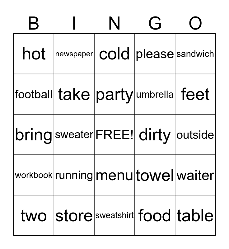 This bingo card has a free space and 24 words: running, store, party, two, sandwich, hot, football, newspaper, dirty, menu, umbrella, bring, towel, waiter, take, food, outside, cold, feet, sweater, table, workbook, please and sweatshirt.