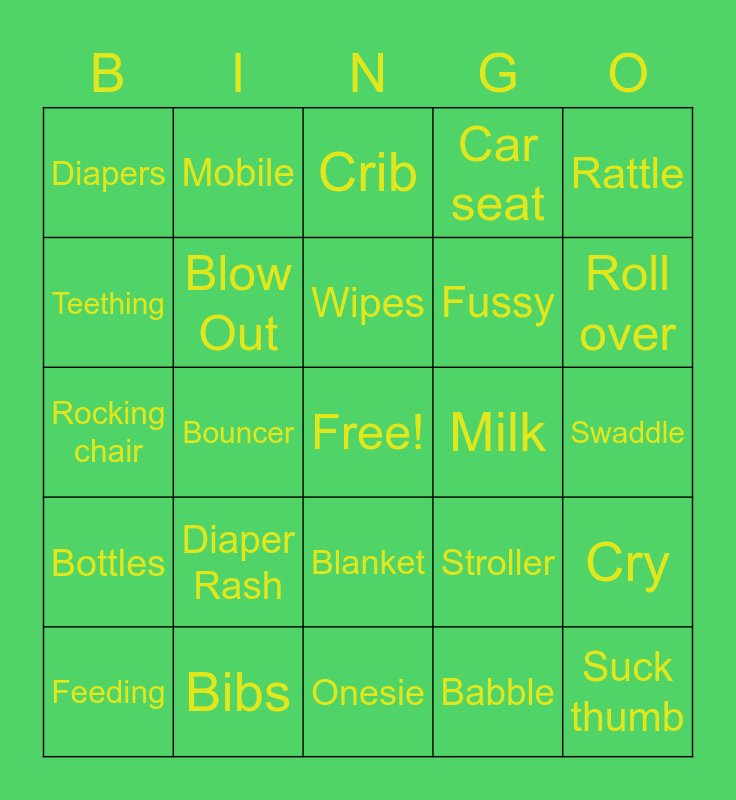 This bingo card has a free space and 29 words: Feeding, Formula, Bouncer, Pacifiers, Diapers, Crib, Blow Out, Diaper Rash, Milk, Bibs, Swaddle, Suck thumb, Onesie, Babble, Roll over, Coo, Blanket, Bottles, Rattle, Rocking chair, Stroller, Colic, Fussy, Teething, Car seat, Mobile, Cry, Wipes and Pack n' Play.