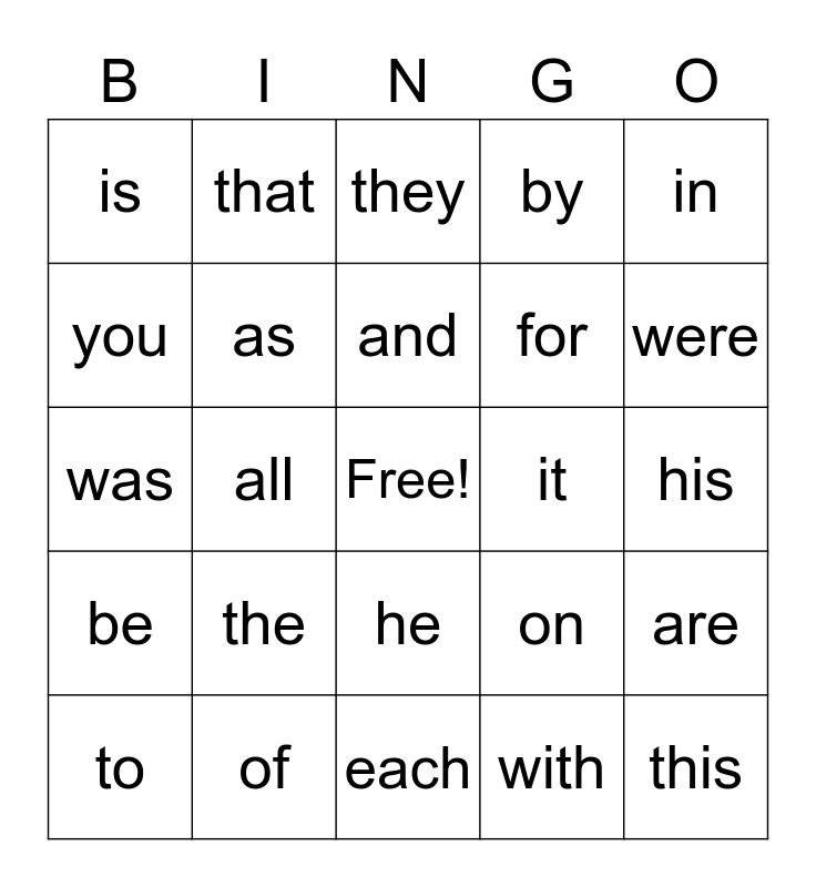 This bingo card has a free space and 24 words: the, of, and, to, in, is, you, that, it, he, for, was, on, are, as, with, his, they, were, all, this, be, by and each.