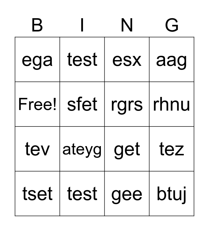 This bingo card has 16 words: test, tez, esx, ega, tev, test, get, gee, Free!, sfet, tset, aag, ateyg, rhnu, rgrs and btuj.