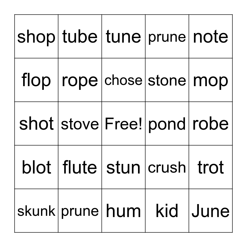 This bingo card has a free space and 24 words: flute, prune, chose, skunk, note, shop, flop, tube, pond, stun, stone, shot, crush, trot, rope, kid, robe, tune, mop, stove, June, blot, prune and hum.
