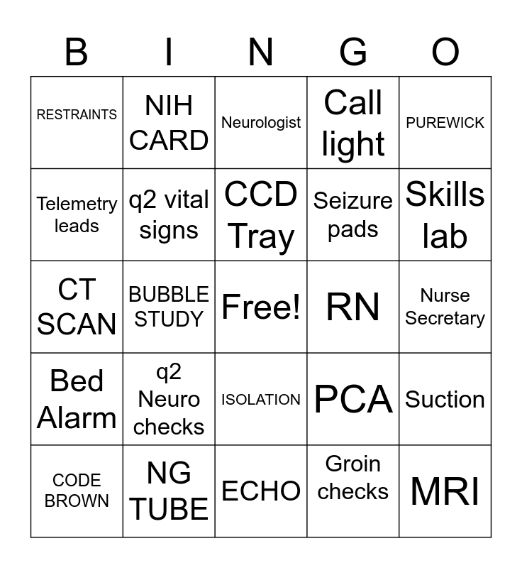This bingo card has a free space and 24 words: q2 Neuro checks, NG TUBE, CCD Tray, CODE BROWN, PUREWICK, RESTRAINTS, Telemetry leads, NIH CARD, RN, ISOLATION, Seizure pads, CT SCAN, PCA, Suction, q2 vital signs, Groin checks, Nurse Secretary, Neurologist, Skills lab, BUBBLE STUDY, MRI, Bed Alarm, Call light and ECHO.