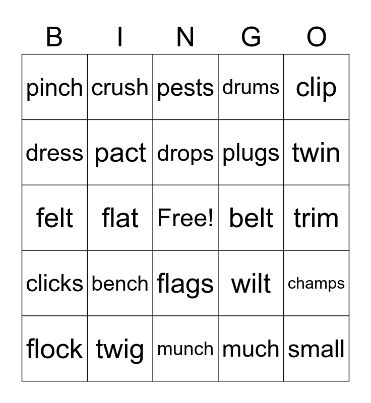 This bingo card has a free space and 29 words: flock, flags, flat, punch, pinch, pests, pact, bench, belt, twig, trim, small, munch, much, twin, drags, flags, clicks, clip, felt, wilt, ponds, plugs, dress, drums, crush, champs, drops and frogs.