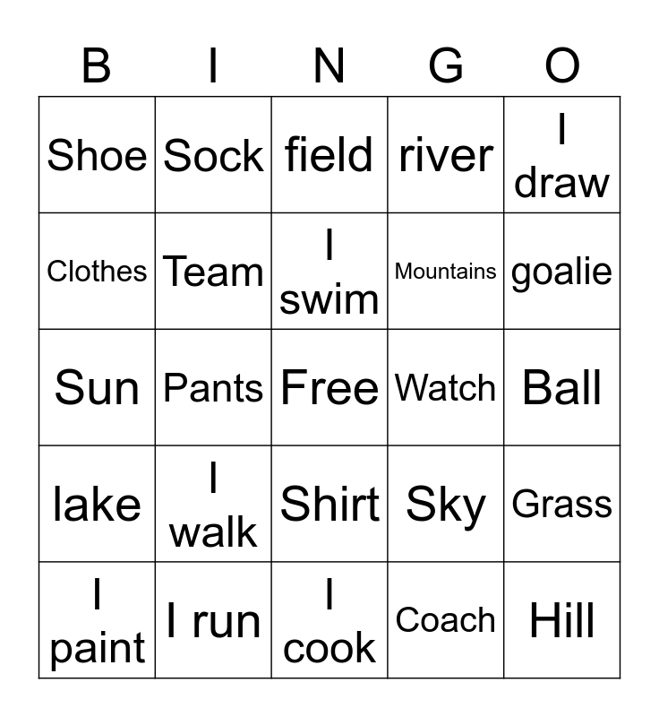 This bingo card has a free space and 24 words: I walk, I run, I swim, I paint, I draw, Shoe, Clothes, Sock, Watch, Shirt, Mountains, Sun, Sky, Grass, Team, Coach, Ball, field, goalie, Pants, Hill, lake, river and I cook.