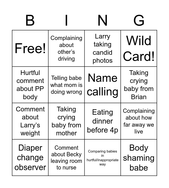 This bingo card has 16 words: Diaper change observer, Comment about Becky leaving room to nurse, Larry taking candid photos, Wild Card!, Hurtful comment about PP body, Complaining about other’s driving, Eating dinner before 4p, Complaining about how far away we live, Free!, Telling babe what mom is doing wrong, Comparing babies in hurtful/inappropriate way, Taking crying baby from Brian, Comment about Larry’s weight, Taking crying baby from mother, Name calling and Body shaming babe.
