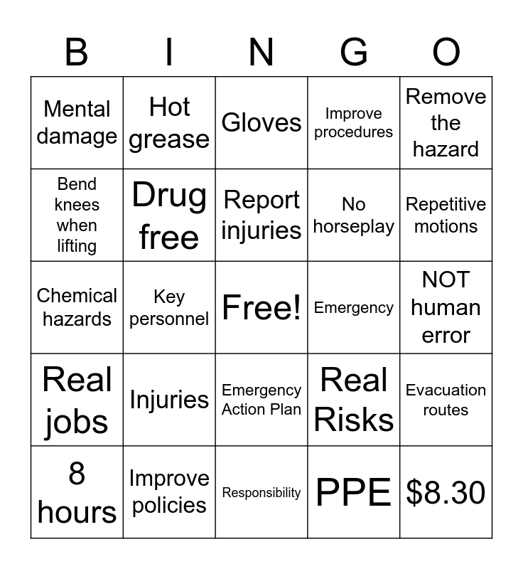 This bingo card has a free space and 43 words: Labor law, $8.30, OSHA, 8 hours, No mining, PPE, Gloves, Ear plugs, Remove the hazard, Improve policies, Improve procedures, Emergency, Emergency Action Plan, Injuries, Rights, Responsibility, Recognize hazards, Chemical hazards, Noise, Repetitive motions, Hot grease, Cleaning products, Physical damage, Mental damage, Unsafe environment, NOT human error, Workplace, Teen worker, Real Risks, Real jobs, Unplanned event, Evacuation routes, Meeting locations, Key personnel, Drills, Work together, First aid, Report injuries, Bend knees when lifting, No horseplay, Stay sober, Drug free and Dept of Labor Wage & Hour Division.