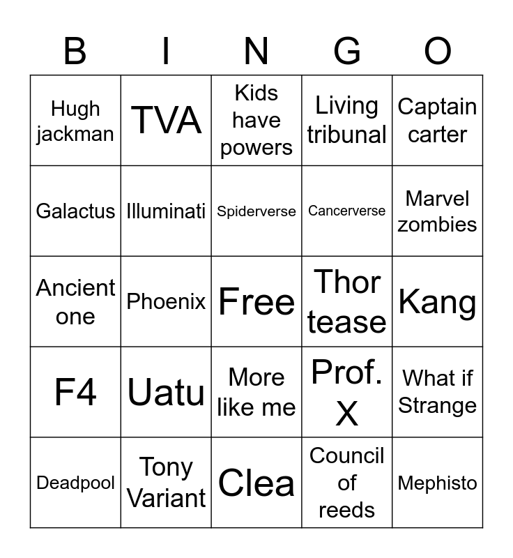 This bingo card has a free space and 24 words: Uatu, Tony Variant, Spiderverse, Deadpool, Captain carter, Hugh jackman, Galactus, TVA, Thor tease, More like me, Cancerverse, Ancient one, Prof. X, What if Strange, Illuminati, Council of reeds, Kang, Kids have powers, Marvel zombies, Phoenix, Mephisto, F4, Living tribunal and Clea.