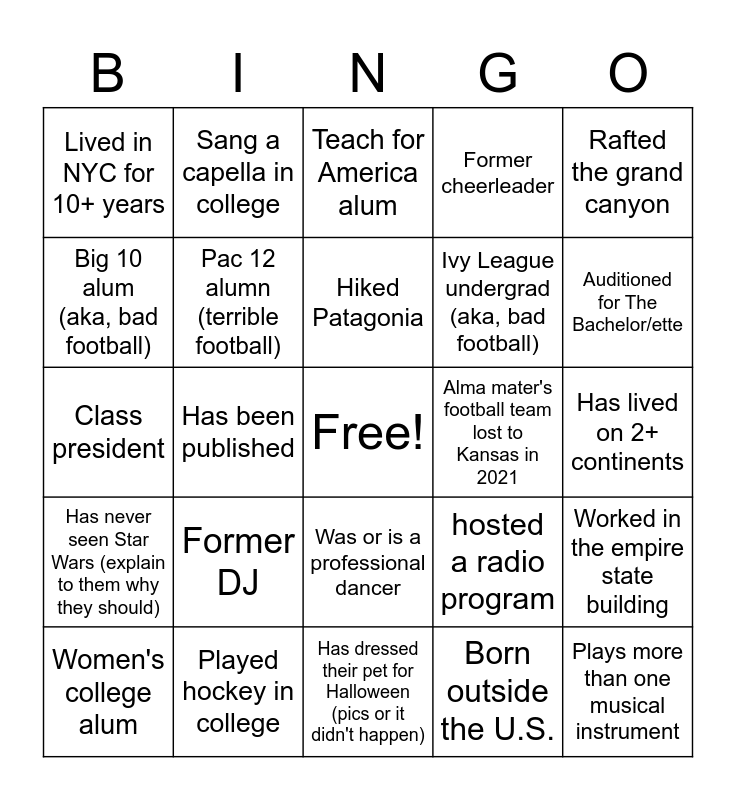 This bingo card has a free space and 34 words: Vegetarian, Born outside the U.S., Member of the clergy, Proud grandparents (and they have to mean it), Has never seen Star Wars (explain to them why they should), Pac 12 alumn (terrible football), Rafted the grand canyon, Women's college alum, Sang a capella in college, Former military, Hiked Patagonia, Teach for America alum, Has backyard chickens, Aggie, Alma mater's football team lost to Kansas in 2021, Auditioned for The Bachelor/ette, Played hockey in college, Class president, Former DJ, hosted a radio program, Was or is a professional dancer, Extra in Varsity Blues, Lived in NYC for 10+ years, Has lived on 2+ continents, Has dressed their pet for Halloween (pics or it didn't happen), Plays more than one musical instrument, Former cheerleader, Born in Texas, Ivy League undergrad (aka, bad football), Big 10 alum (aka, bad football), Got engaged in 2021 (copy cats), Has been published, Worked in the empire state building and Works/ed for the government.