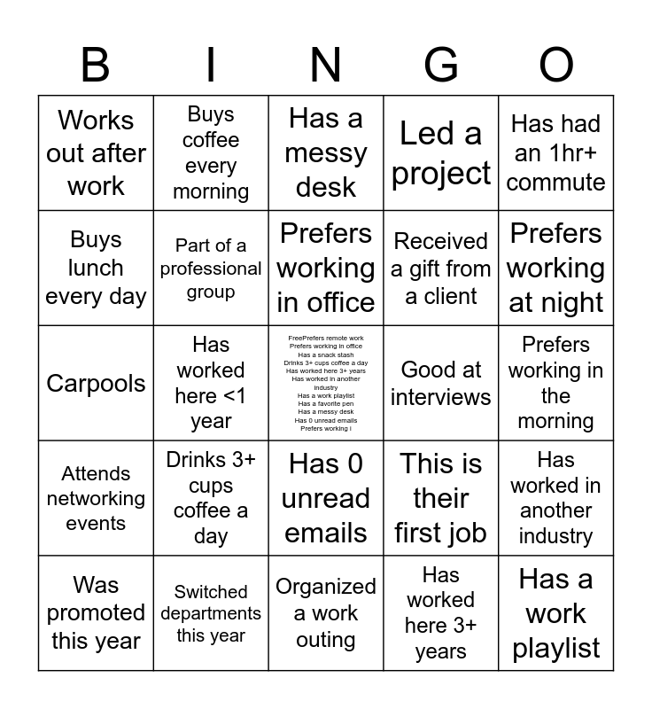 This bingo card has 1 images, a free space and 42 words: Prefers remote work, Prefers working in office, Has a snack stash, Drinks 3+ cups coffee a day, Has worked here 3+ years, Has worked in another industry, Has a work playlist, Has a favorite pen, Has a messy desk, Has 0 unread emails, Prefers working in the morning, Prefers working at night, Has worked here <1 year, Has had an 1hr+ commute, Manager, This is their first job, Bikes to work, Carpools, Runs errands during lunch break, Buys coffee every morning, Buys lunch every day, Played prank on a coworker, Works out before work, Works out after work, Has taken kid to work, Has been employee of the month, Received a gift from a client, Mentioned by name in good review, Was one of the original employees, Worked for a rival company, Mentor, Attends networking events, Part of a professional group, Organized a work outing, Going on vacation soon, Was promoted this year, Switched departments this year, Good at interviews, Bad at interviews, Hired an employee, Led a project and Planned a work party.