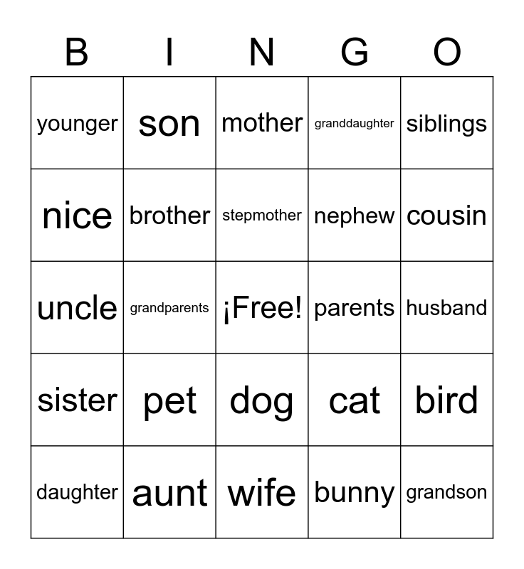 This bingo card has a free space and 33 words: grandma, grandpa, grandparents, family, sister, brother, siblings, daughter, son, children, stepmother, mother, father, stepfather, parents, cousin, aunt, uncle, pet, cat, dog, older, younger, husband, wife, grandson, granddaughter, nephew, nice, bird, fish, bunny and frog.