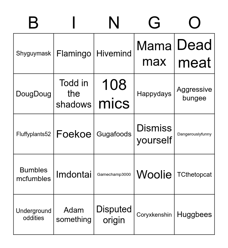 This bingo card has a free space and 24 words: Underground oddities, Imdontai, 108 mics, Coryxkenshin, Dead meat, Shyguymask, Flamingo, Hivemind, Dismiss yourself, Dangerouslyfunny, Fluffyplants52, Todd in the shadows, Woolie, TCthetopcat, DougDoug, Adam something, Disputed origin, Mama max, Aggressive bungee, Bumbles mcfumbles, Foekoe, Gamechamp3000, Happydays and Huggbees.