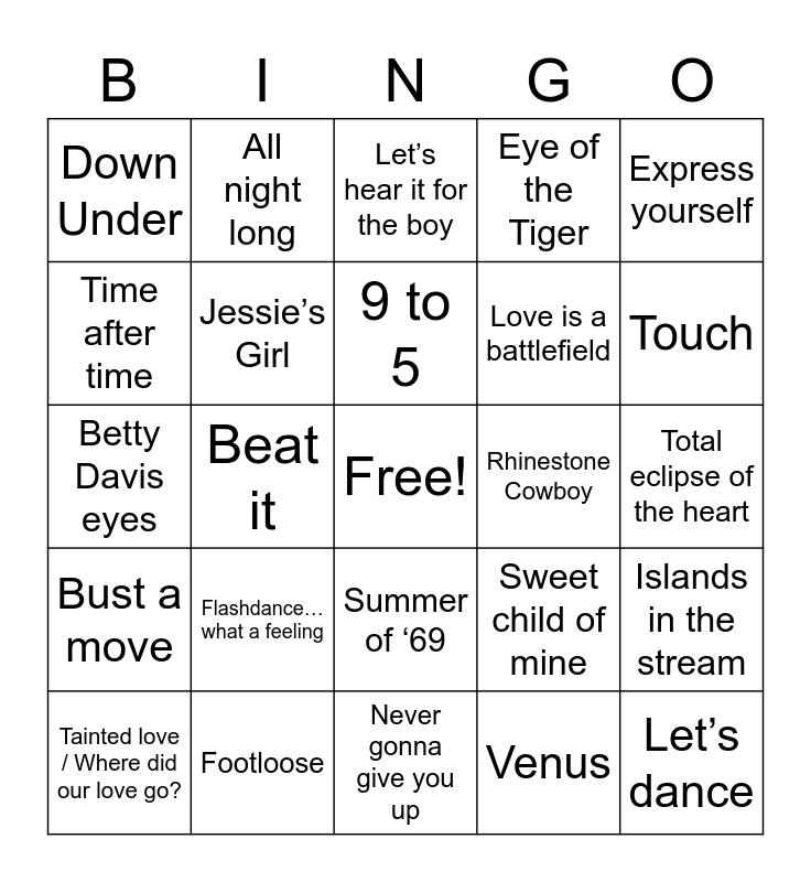 This bingo card has a free space and 46 words: New Sensation, Let’s dance, She works hard for the money, Never gonna give you up, Flashdance…what a feeling, Call me, All night long, Love Shack, Time after time, Pour some sugar on me, Jessie’s Girl, Eye of the Tiger, Islands in the stream, Sweet child of mine, We didn’t start the fire, Jack & Diane, 9 to 5, Rhinestone Cowboy, Faith, Express yourself, Beat it, Venus, Down Under, Love is a battlefield, Africa, Touch, Tainted love / Where did our love go?, I’m still standing, Summer of ‘69, Bust a move, When you’re in love with a beautiful woman, Get outta my dreams, get into my car, Poison, Pleasure and Pain, Dancing in the dark, Footloose, Total eclipse of the heart, All I wanna do is make love to you, Little lies, Your mama don’t dance, Hot in the city, Let’s hear it for the boy, Betty Davis eyes, Push it, I’m gonna be (500 miles) and She drives me crazy.