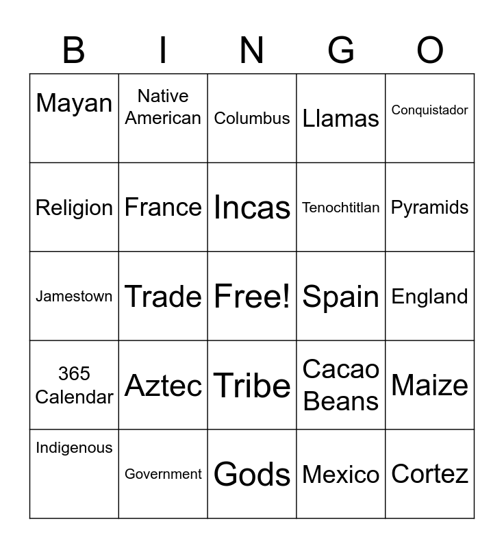 This bingo card has a free space and 24 words: Indigenous, Aztec, Incas, Mexico, Conquistador, Mayan, Native American, Columbus, Spain, England, Jamestown, France, Cacao Beans, Maize, Religion, Government, Gods, Llamas, Pyramids, 365 Calendar, Trade, Tribe, Tenochtitlan and Cortez.