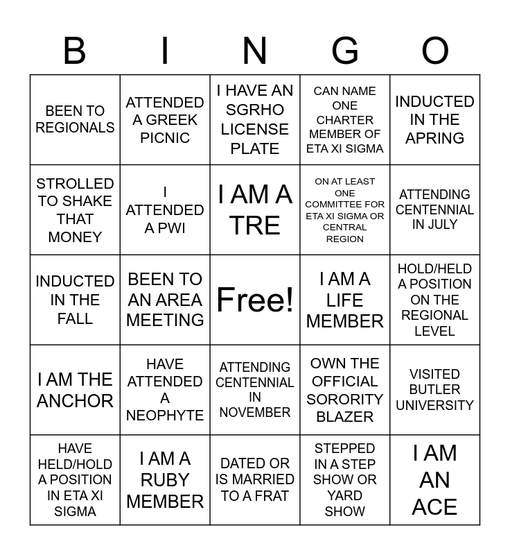 This bingo card has a free space and 24 words: HAVE HELD/HOLD A POSITION IN ETA XI SIGMA, HAVE ATTENDED A NEOPHYTE, I AM A TRE, STEPPED IN A STEP SHOW OR YARD SHOW, INDUCTED IN THE APRING, BEEN TO REGIONALS, ATTENDED A GREEK PICNIC, I HAVE AN SGRHO LICENSE PLATE, I AM A LIFE MEMBER, HOLD/HELD A POSITION ON THE REGIONAL LEVEL, INDUCTED IN THE FALL, I ATTENDED A PWI, OWN THE OFFICIAL SORORITY BLAZER, VISITED BUTLER UNIVERSITY, STROLLED TO SHAKE THAT MONEY, I AM A RUBY MEMBER, DATED OR IS MARRIED TO A FRAT, CAN NAME ONE CHARTER MEMBER OF ETA XI SIGMA, ATTENDING CENTENNIAL IN JULY, I AM THE ANCHOR, BEEN TO AN AREA MEETING, ATTENDING CENTENNIAL IN NOVEMBER, ON AT LEAST ONE COMMITTEE FOR ETA XI SIGMA OR CENTRAL REGION and I AM AN ACE.