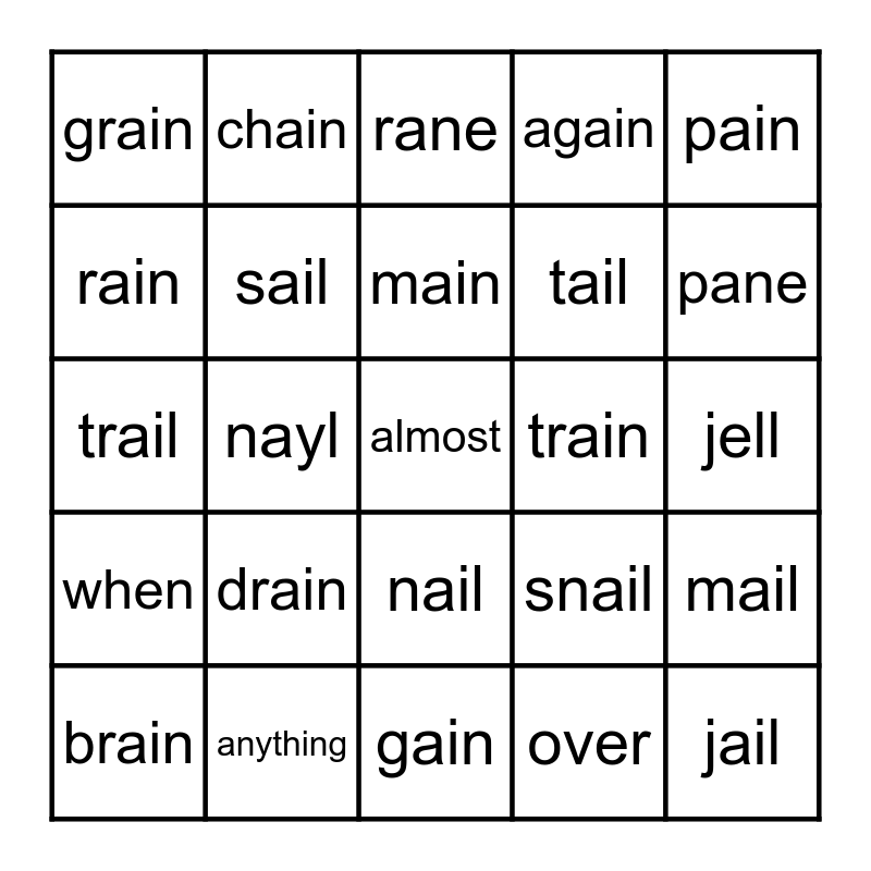 This bingo card has 25 words: drain, gain, main, brain, pain, grain, rain, chain, train, nail, tail, trail, snail, mail, sail, jail, jell, rane, pane, nayl, almost, anything, when, again and over.