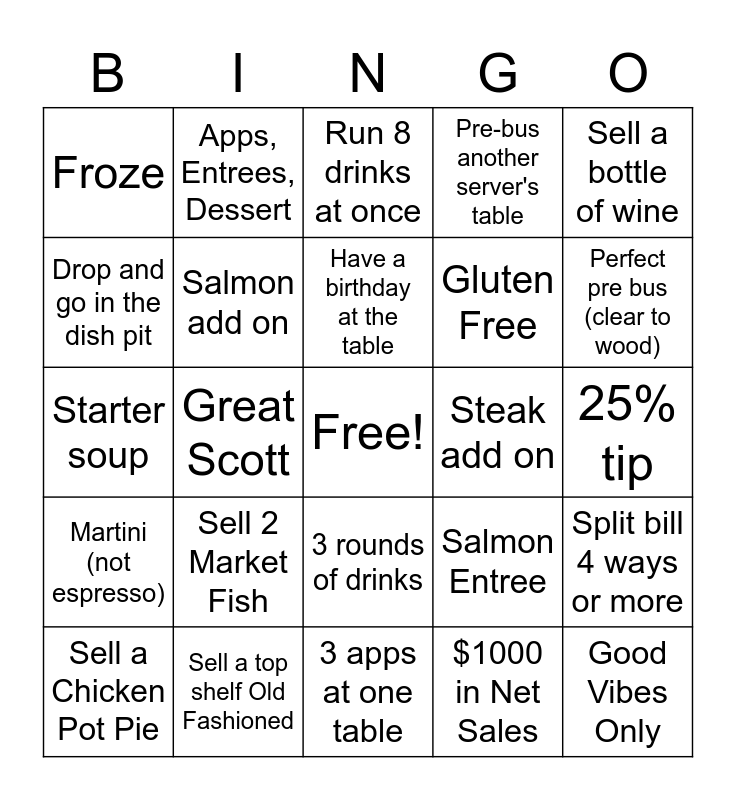 This bingo card has a free space and 24 words: Sell 2 Market Fish, Sell a top shelf Old Fashioned, Have a birthday at the table, Sell a Chicken Pot Pie, Sell a bottle of wine, Froze, Drop and go in the dish pit, Apps, Entrees, Dessert, Steak add on, 3 rounds of drinks, Gluten Free, Starter soup, Salmon Entree, Split bill 4 ways or more, Salmon add on, $1000 in Net Sales, 25% tip, Run 8 drinks at once, Perfect pre bus (clear to wood), Great Scott, Good Vibes Only, Martini (not espresso), Pre-bus another server's table and 3 apps at one table.