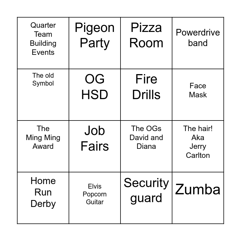 This bingo card has 24 words: SPARC, Secret Santa, Face Mask, Snack Shack, The old Symbol, Quarter Team Building Events, OG HSD, Pigeon Party, Elvis Popcorn Guitar, Lunch Puzzles, The Ming Ming Award, The OGs David and Diana, Elvis Popcorn Guitar, Mannequins, Fire Drills, CPR Training, Security guard, Pizza Room, Job Fairs, The hair! Aka Jerry Carlton, Home Run Derby, Zumba, Powerdrive band and Not UI.