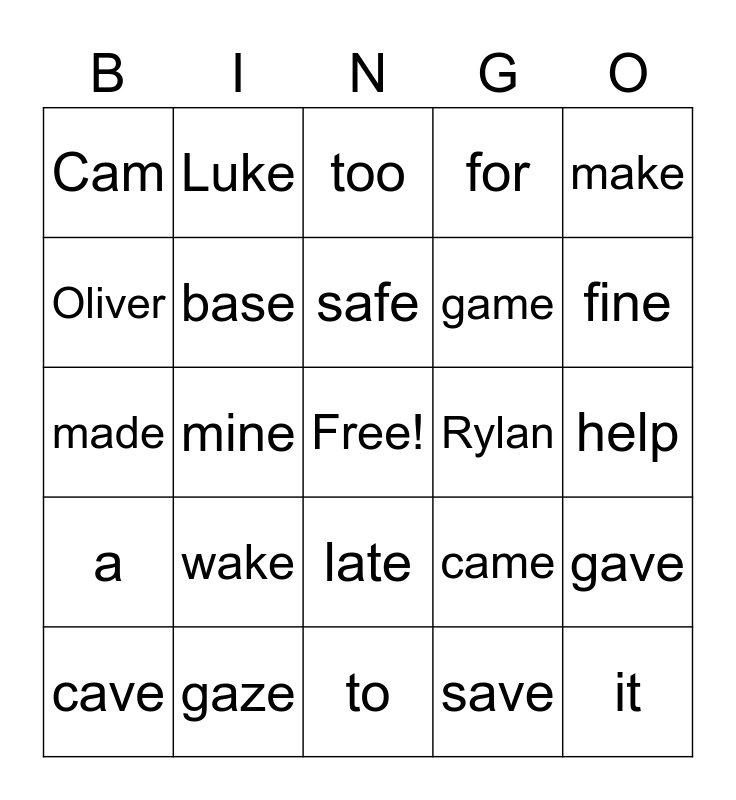 This bingo card has a free space and 24 words: wake, gaze, safe, cave, make, Cam, Oliver, Luke, Rylan, late, game, made, came, gave, base, save, help, too, fine, mine, it, a, for and to.
