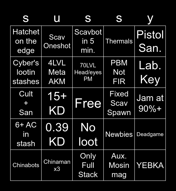 This bingo card has a free space and 24 words: 0.39 KD, Chinaman x3, 70LVL Head/eyes PM, Chinabots, Pistol San., Hatchet on the edge, Cyber's lootin stashes, Scav Oneshot, Fixed Scav Spawn, No loot, PBM Not FIR, Cult + San, Newbies, Deadgame, 4LVL Meta AKM, Aux. Mosin mag, Jam at 90%+, Scavbot in 5 min., Lab. Key, 15+ KD, YEBKA, 6+ AC in stash, Thermals and Only Full Stack.