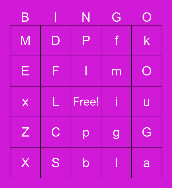 This bingo card has a free space and 50 words: A, a, B, b, C, c, D, d, E, e, F, f, G, g, H, h, I, i, K, k, L, l, M, m, N, n, O, o, P, p, Q, q, R, r, S, s, T, t, U, u, V, v, W, w, X, x, Y, y, Z and z.