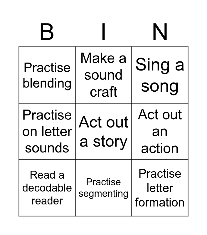 This bingo card has 9 words: Read a decodable reader, Sing a song, Make a sound craft, Practise on letter sounds, Practise blending, Act out an action, Act out a story, Practise letter formation and Practise segmenting.
