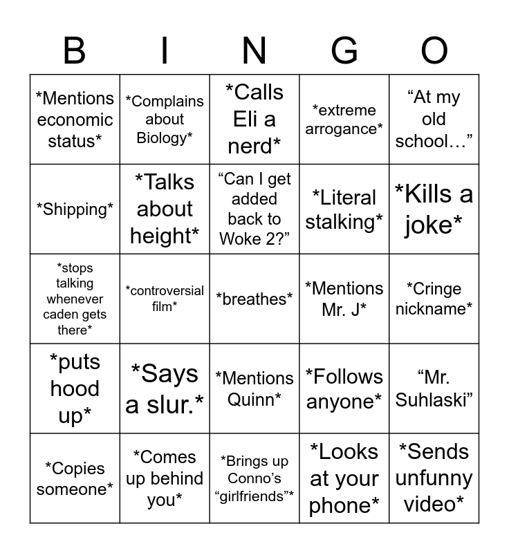 This bingo card has a free space and 24 words: *Says a slur.*, *Comes up behind you*, “Can I get added back to Woke 2?”, *Copies someone*, “At my old school…”, *Mentions economic status*, *Shipping*, *Complains about Biology*, *Mentions Mr. J*, *Mentions Quinn*, *Literal stalking*, *stops talking whenever caden gets there*, *Follows anyone*, “Mr. Suhlaski”, *Talks about height*, *Looks at your phone*, *Cringe nickname*, *Calls Eli a nerd*, *Kills a joke*, *controversial film*, *Sends unfunny video*, *puts hood up*, *extreme arrogance* and *Brings up Conno’s “girlfriends”*.