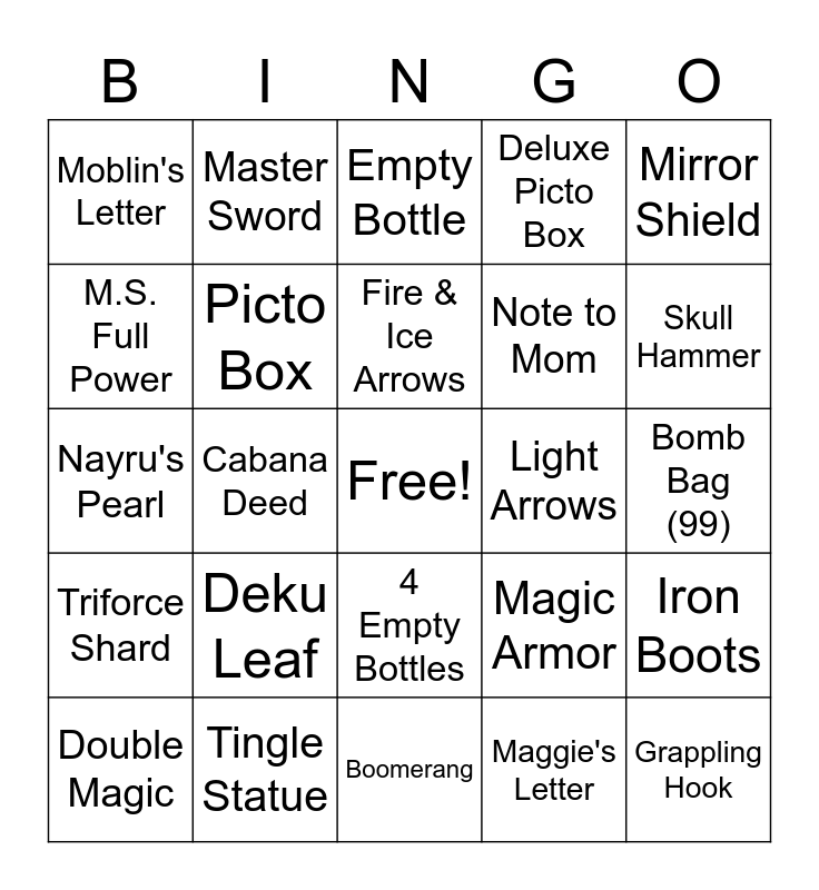 This bingo card has a free space and 50 words: Telescope, Grappling Hook, Spoils Bag, Boomerang, Deku Leaf, Hero's Sword, Master Sword, M.S. Half Power, M.S. Full Power, Tingle Tuner, Picto Box, Deluxe Picto Box, Iron Boots, Magic Armor, Bait Bag, Hero's Bow, Fire & Ice Arrows, Light Arrows, Bombs, Mirror Shield, Cabana Deed, Maggie's Letter, Moblin's Letter, Note to Mom, Delivery Bag, Hookshot, Skull Hammer, Power Bracelets, Empty Bottle, 4 Empty Bottles, Command Melody, Earth God's Lyric, Wind God's Aria, Hero's Charm, Tingle Statue, 5 Tingle Statues, Ghost Ship Chart, Hurricane Spin, Bomb Bag (60), Bomb Bag (99), Quiver (60), Quiver (99), Wallet (1000), Wallet (5000), Double Magic, Nayru's Pearl, Din's Pearl, Farore's Pearl, Triforce Shard and 8 Triforce Shards.