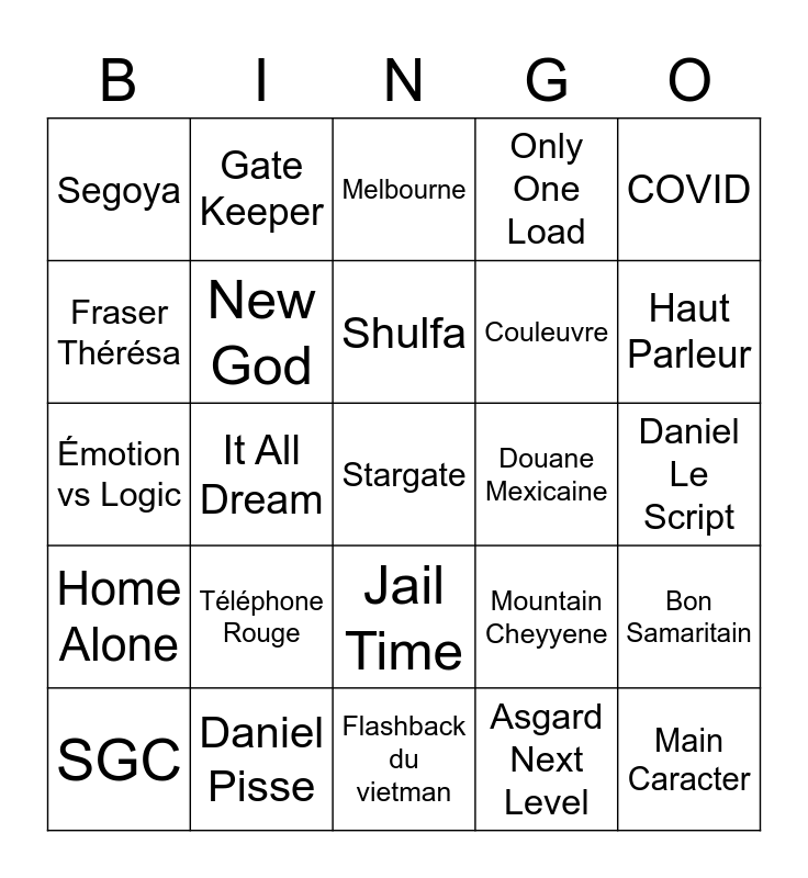 This bingo card has a free space and 24 words: Téléphone Rouge, Daniel Pisse, Shulfa, SGC, COVID, Segoya, Fraser Thérésa, Gate Keeper, Douane Mexicaine, Jail Time, Couleuvre, Émotion vs Logic, Mountain Cheyyene, Bon Samaritain, New God, Asgard Next Level, Daniel Le Script, Melbourne, Haut Parleur, It All Dream, Main Caracter, Home Alone, Only One Load and Flashback du vietman.