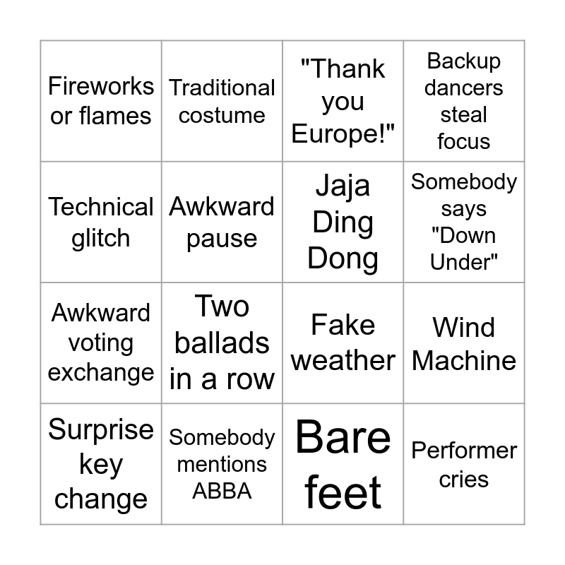 This bingo card has 20 words: Wind Machine, Costume Change, "Thank you Europe!", Singer winks at camera, Surprise key change, Technical glitch, Somebody mentions ABBA, Fireworks or flames, Awkward voting exchange, Traditional costume, Two ballads in a row, Fake weather, Awkward pause, Performer cries, Jaja Ding Dong, Out of tune, Somebody says "Down Under", Backup dancers steal focus, Bare feet and Political message.