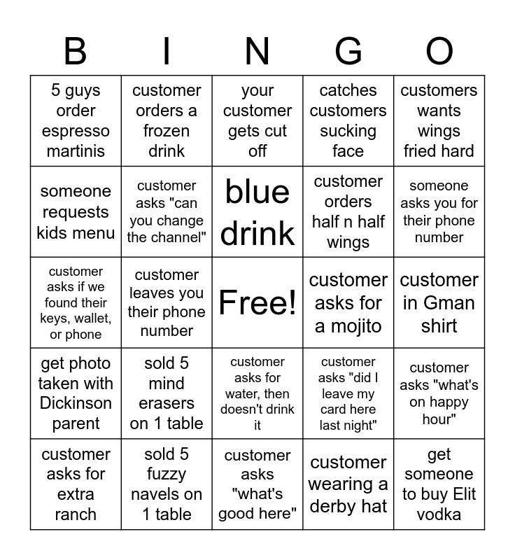 This bingo card has a free space and 24 words: sold 5 mind erasers on 1 table, sold 5 fuzzy navels on 1 table, blue drink, customer asks for extra ranch, customers wants wings fried hard, 5 guys order espresso martinis, someone requests kids menu, customer orders a frozen drink, customer asks for a mojito, customer asks for water, then doesn't drink it, customer orders half n half wings, customer asks if we found their keys, wallet, or phone, customer asks "did I leave my card here last night", customer asks "what's on happy hour", customer asks "can you change the channel", customer wearing a derby hat, customer in Gman shirt, your customer gets cut off, someone asks you for their phone number, customer leaves you their phone number, get someone to buy Elit vodka, get photo taken with Dickinson parent, catches customers sucking face and customer asks "what's good here".