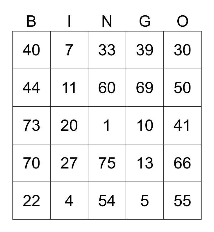This bingo card has a free space and 24 words: 27, 4, 60, 22, 30, 40, 44, 7, 10, 75, 69, 73, 13, 66, 11, 5, 41, 33, 50, 20, 55, 70, 39 and 54.