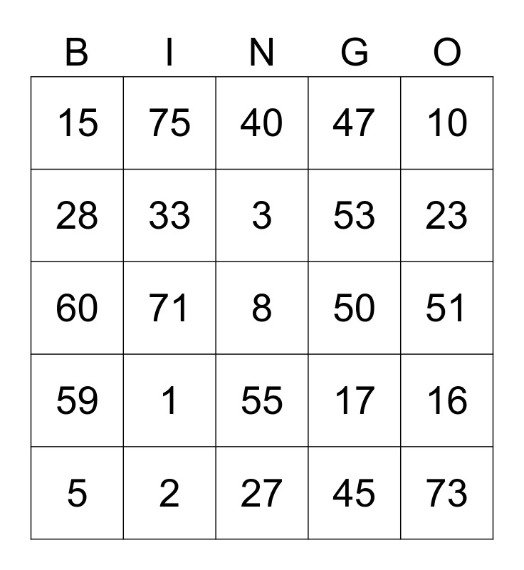 This bingo card has a free space and 24 words: 1, 2, 3, 5, 10, 15, 28, 75, 50, 55, 53, 60, 17, 16, 33, 45, 51, 40, 23, 71, 73, 59, 47 and 27.