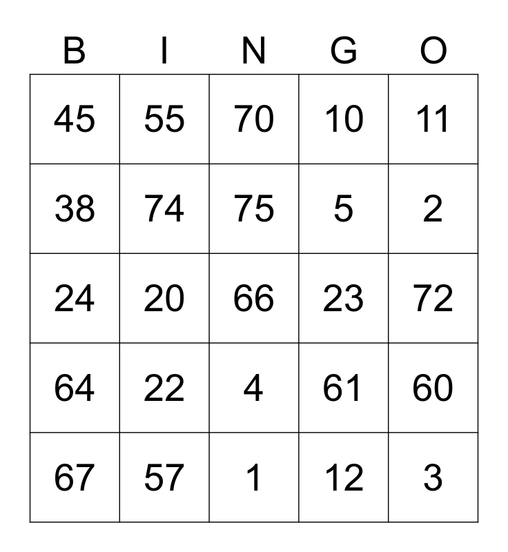 This bingo card has a free space and 24 words: 67, 22, 75, 12, 11, 45, 55, 70, 23, 72, 24, 74, 61, 60, 38, 57, 1, 10, 2, 64, 20, 4, 5 and 3.