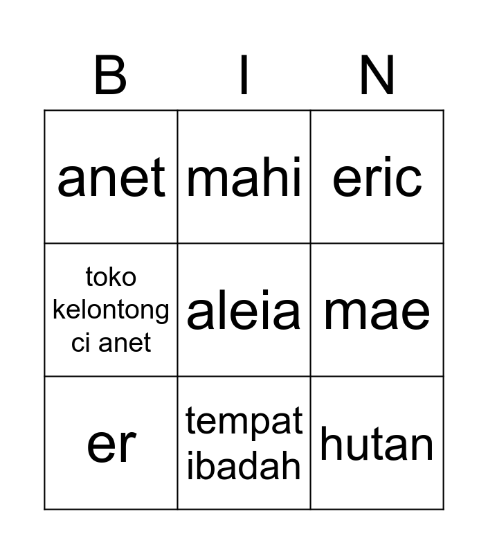 This bingo card has a free space and 8 words: mae, eric, mahi, er, anet, hutan, toko kelontong ci anet and tempat ibadah.