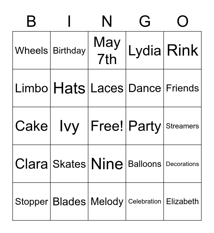 This bingo card has a free space and 24 words: Skates, Blades, Laces, Stopper, Rink, Wheels, Limbo, Birthday, Party, Nine, Dance, Cake, Balloons, Decorations, Hats, Celebration, Streamers, May 7th, Friends, Ivy, Elizabeth, Clara, Lydia and Melody.