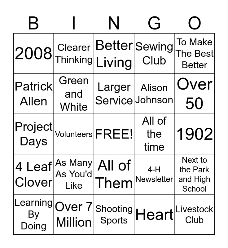 This bingo card has a free space and 34 words: Head, Heart, Hands, Health, 4 Leaf Clover, Green and White, To Make The Best Better, Learning By Doing, Clearer Thinking, Greater Loyalty, Larger Service, Better Living, 4th Grade, 9-18, All of the time, Over 50, Over 7 Million, Project Days, As Many As You'd Like, 4-H Newsletter, All of Them, Nothing, 2008, 1902, Shooting Sports, Livestock Club, Sewing Club, Dog Club, Alison Johnson, Patrick Allen, Mason Forsythe, Volunteers, Next to the Park and High School and UK and Kentucky State University.