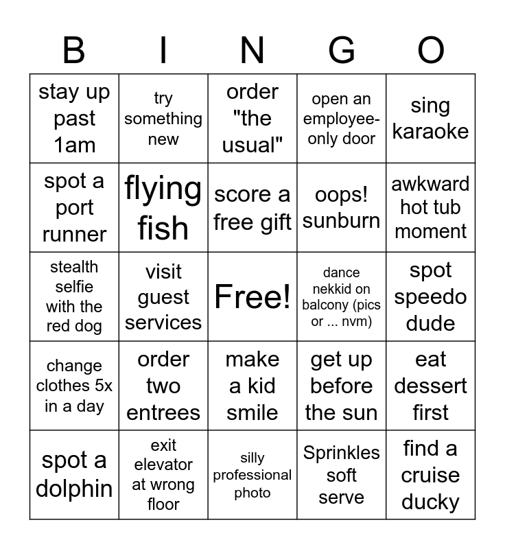 This bingo card has a free space and 24 words: order two entrees, exit elevator at wrong floor, score a free gift, spot a dolphin, sing karaoke, stay up past 1am, spot a port runner, try something new, dance nekkid on balcony (pics or ... nvm), make a kid smile, oops! sunburn, stealth selfie with the red dog, get up before the sun, eat dessert first, flying fish, Sprinkles soft serve, spot speedo dude, order "the usual", awkward hot tub moment, visit guest services, find a cruise ducky, change clothes 5x in a day, open an employee-only door and silly professional photo.