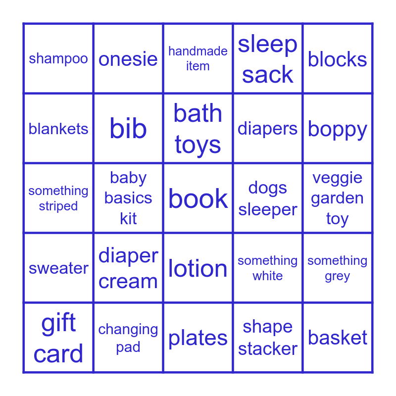 This bingo card has a free space and 59 words: baby pants, changing pad, bottles, sweater, shape stacker, rattle, bib, hat, diapers, something for Cabot, sleep sack, organizer, blankets, animals sleeper, swing, shampoo, basket, blocks, sound machine, bath toys, dogs sleeper, handmade item, gift card, something grey, pacifier, teether, hooded towel, diaper genie, boppy, something green, tool belt, toothbrush, diaper cake, wipes, onesie, crib sheet, booties, baby basics kit, bathtub kneeler, something striped, something musical, diaper cream, veggie garden toy, spoons, sunglasses, socks, bath tub, wash cloths, lotion, plates, Haakaa breast pump, stacking cups, milk storage bags, stuffed animal, poncho, something white, picture frame, burp cloths and car seat mirror.