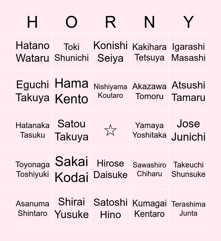 This bingo card has a free space and 24 words: Sakai Kodai, Shirai Yusuke, Nishiyama Koutaro, Asanuma Shintaro, Igarashi Masashi, Hatano Wataru, Eguchi Takuya, Toki Shunichi, Yamaya Yoshitaka, Hirose Daisuke, Akazawa Tomoru, Hatanaka Tasuku, Sawashiro Chiharu, Takeuchi Shunsuke, Hama Kento, Kumagai Kentaro, Jose Junichi, Konishi Seiya, Atsushi Tamaru, Satou Takuya, Terashima Junta, Toyonaga Toshiyuki, Kakihara Tetsuya and Satoshi Hino.