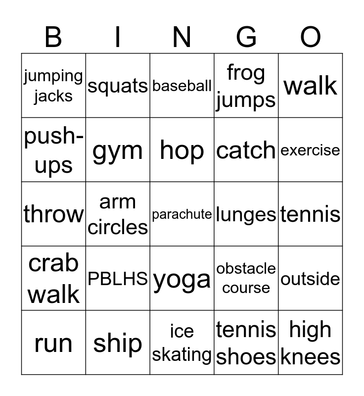 This bingo card has a free space and 24 words: PBLHS, ship, hop, run, walk, jumping jacks, push-ups, squats, lunges, yoga, catch, throw, obstacle course, outside, gym, tennis shoes, tennis, baseball, exercise, arm circles, high knees, crab walk, frog jumps and ice skating.