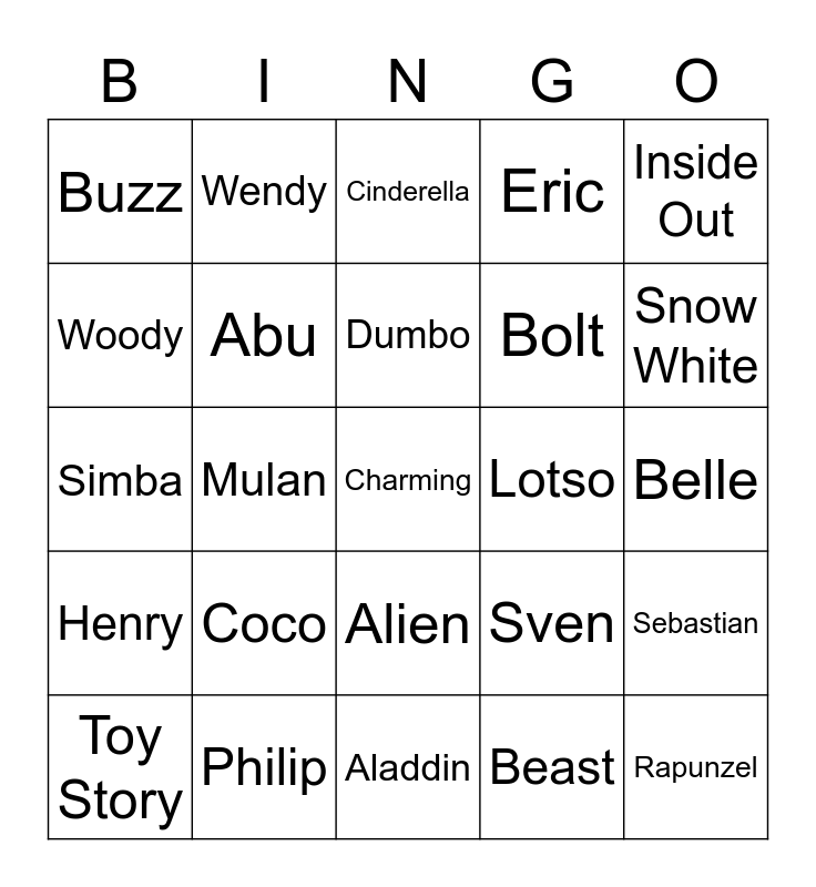 This bingo card has 25 words: Coco, Aladdin, Dumbo, Toy Story, Inside Out, Buzz, Woody, Wendy, Lotso, Alien, Bolt, Simba, Sven, Sebastian, Abu, Rapunzel, Belle, Cinderella, Snow White, Mulan, Charming, Philip, Henry, Eric and Beast.
