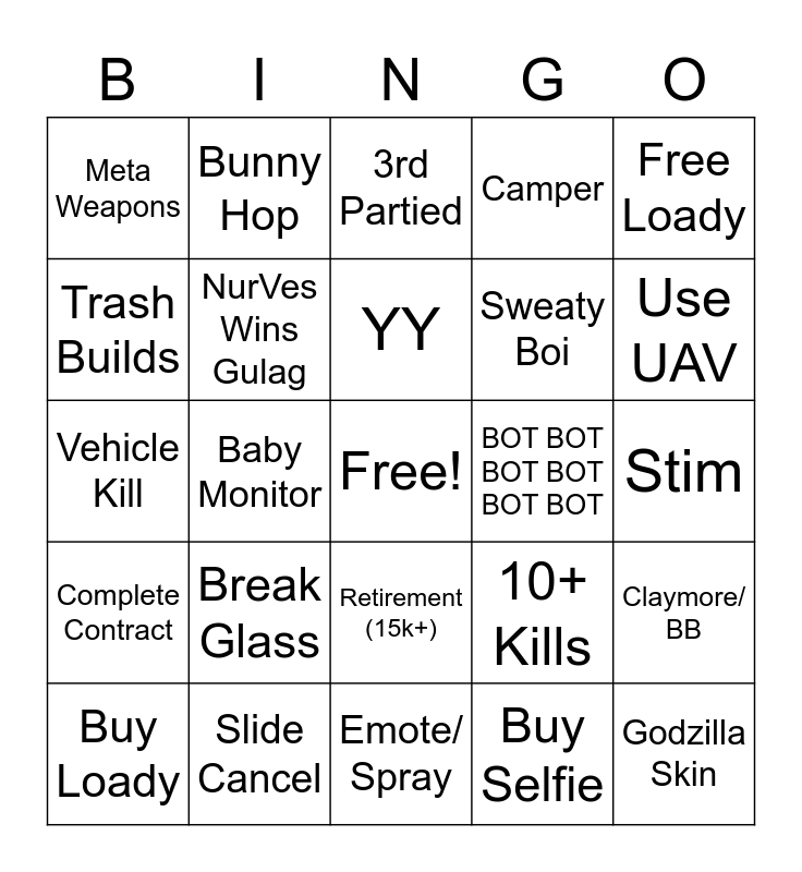 This bingo card has a free space and 24 words: Break Glass, Slide Cancel, YY, Buy Loady, Free Loady, Meta Weapons, Trash Builds, Bunny Hop, BOT BOT BOT BOT BOT BOT, Retirement (15k+), Sweaty Boi, Vehicle Kill, 10+ Kills, Claymore/ BB, NurVes Wins Gulag, Buy Selfie, Stim, 3rd Partied, Use UAV, Baby Monitor, Godzilla Skin, Complete Contract, Camper and Emote/ Spray.