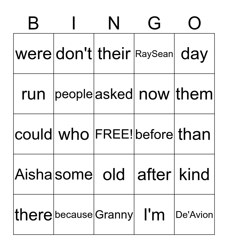 This bingo card has a free space and 24 words: some, because, asked, there, day, were, run, don't, before, old, now, could, after, kind, people, I'm, than, their, them, who, De'Avion, Aisha, RaySean and Granny.