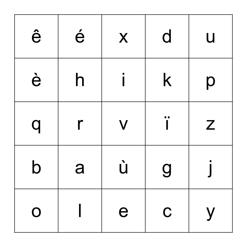 This bingo card has 25 words: a, e, i, o, u, ê, è, é, ï, ù, k, q, g, j, h, y, z, x, p, r, v, l, b, d and c.
