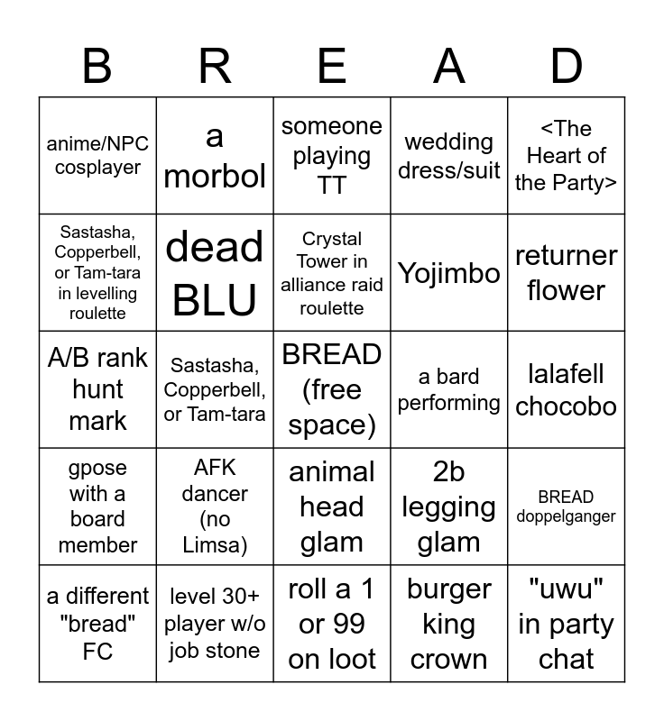 This bingo card has a free space and 24 words: AFK dancer (no Limsa), level 30+ player w/o job stone, Crystal Tower in alliance raid roulette, a different "bread" FC, <The Heart of the Party>, anime/NPC cosplayer, Sastasha, Copperbell, or Tam-tara in levelling roulette, a morbol, a bard performing, animal head glam, Yojimbo, A/B rank hunt mark, 2b legging glam, BREAD doppelganger, dead BLU, burger king crown, lalafell chocobo, someone playing TT, returner flower, Sastasha, Copperbell, or Tam-tara, "uwu" in party chat, gpose with a board member, wedding dress/suit and roll a 1 or 99 on loot.