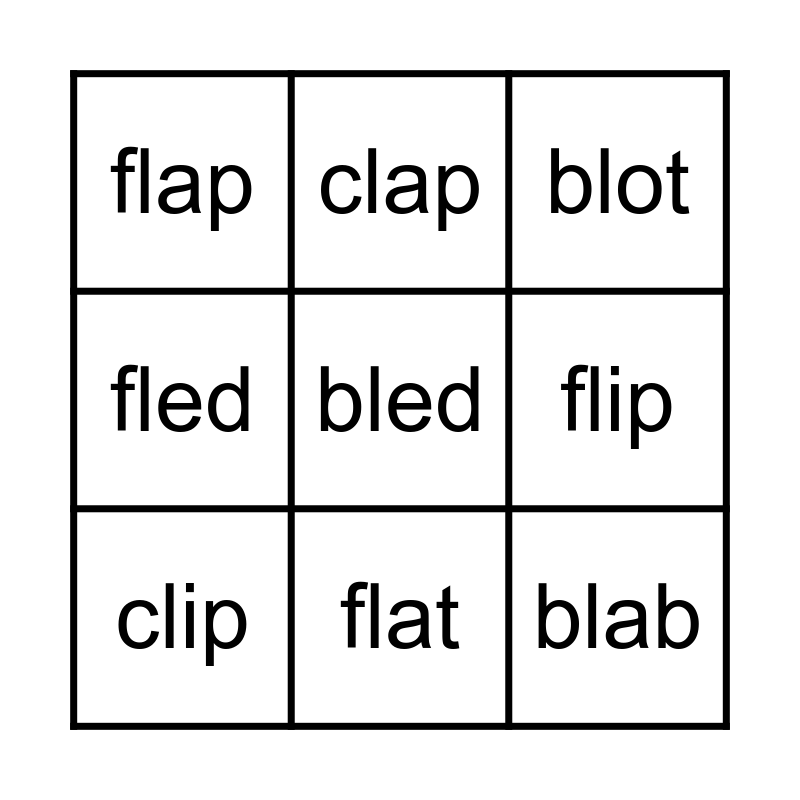 This bingo card has a free space and 8 words: flip, blot, clap, clip, flap, blab, fled and flat.