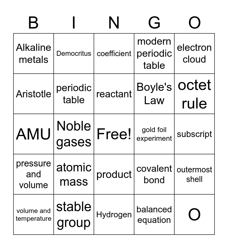This bingo card has a free space and 34 words: Fe, balanced equation, ionic bond, Mendeleev, pressure and volume, periodic table, electron cloud, volume and temperature, Democritus, group 16, reactant, coefficient, plum pudding model, neutron, gold foil experiment, octet rule, stable group, AMU, atomic mass, covalent bond, product, 6 shared electrons, Alkaline metals, subscript, Hydrogen, O, modern periodic table, Ne, Boyle's Law, Aristotle, Charles' Law, Noble gases, outermost shell and 7 valence electrons.