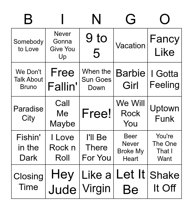 This bingo card has a free space and 24 words: I Love Rock n Roll, Hey Jude, When the Sun Goes Down, Closing Time, Fancy Like, Somebody to Love, We Don't Talk About Bruno, Never Gonna Give You Up, We Will Rock You, I'll Be There For You, Barbie Girl, Paradise City, Beer Never Broke My Heart, You're The One That I Want, Free Fallin', Let It Be, Uptown Funk, 9 to 5, I Gotta Feeling, Call Me Maybe, Shake It Off, Fishin' in the Dark, Vacation and Like a Virgin.